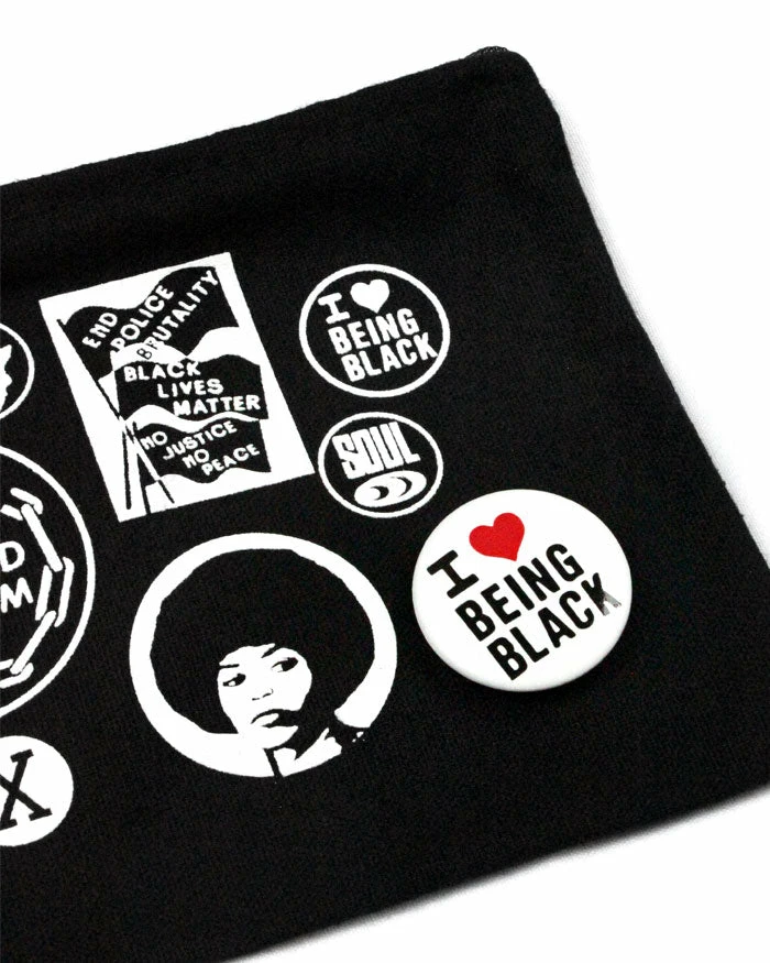 This limited edition bag includes a “I Love Being Black“ pinback button with purchase, that adds dimension and depth to the printed design.