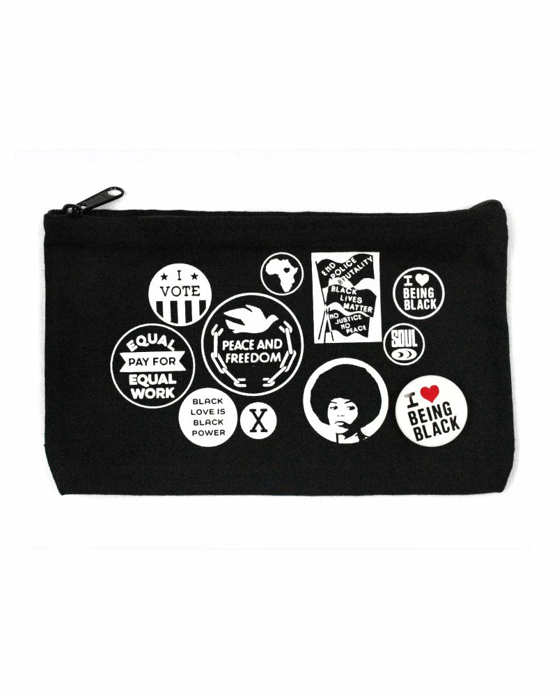 Classic zipper pouch bag with reproductions campaign and activist buttons in the archives of the National Museum of African American Culture and History.