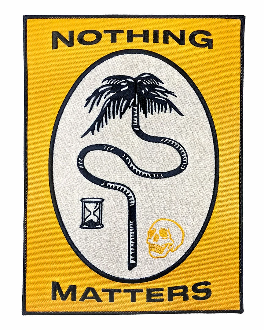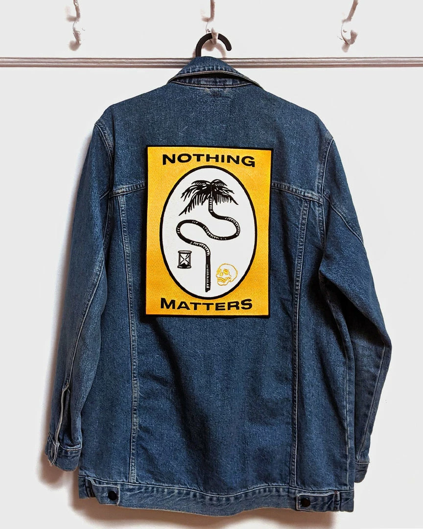 Nothing matters! So relax. Time doesn’t matter. Your worries don’t matter. Take a break under this squiggly palm tree. Keep this attached to your denim jacket to remind you to chill.