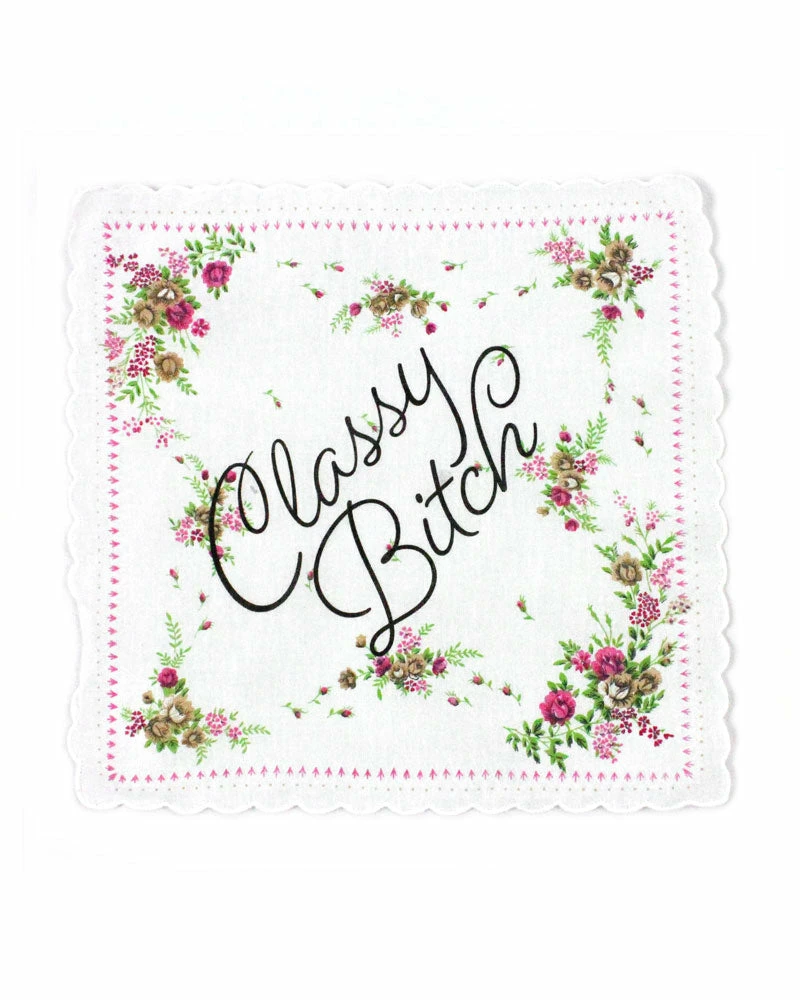 A classic hanky with a modern, fun twist. This tongue-in-cheek design can be used for decoration, an accessory, a playful gift, or what it’s really meant for: an eco-friendly way to help sop up ugly cries and the sniffles!