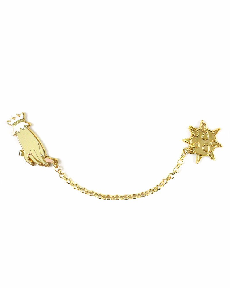 Connect these two pins to either side of your collar ends, or let the chain dangle over a pocket lapel. Add some danger to your style!