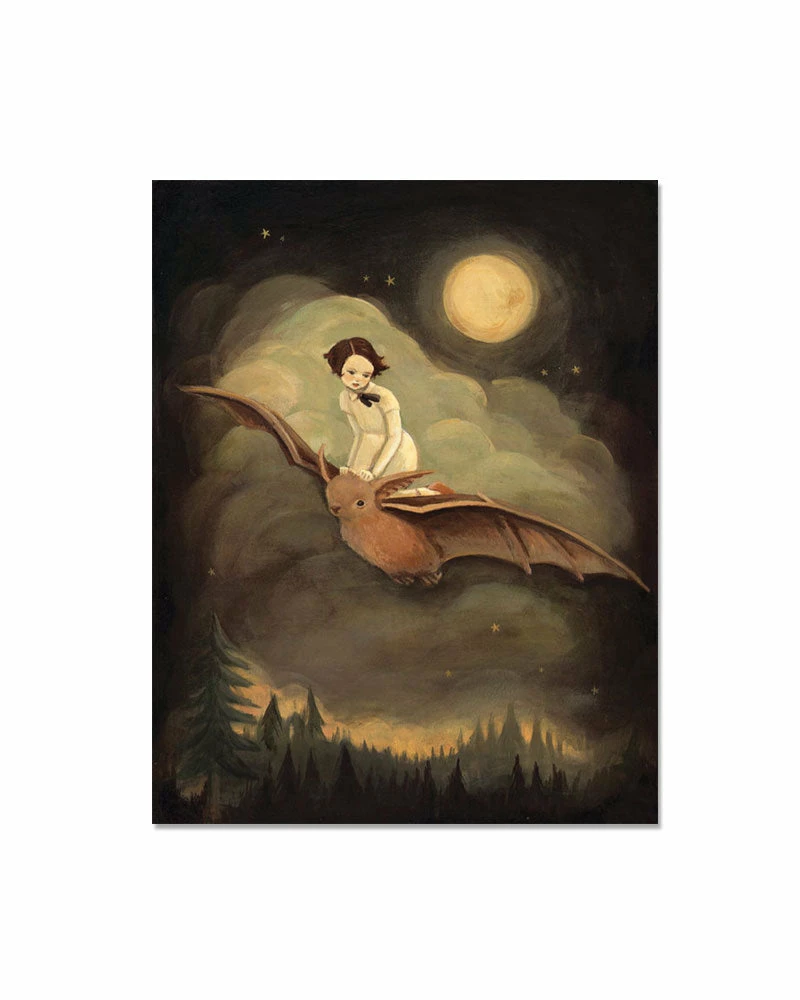 A girl and her bat soar beyond the golden moon, flying over fir forests with the faintest pink of dawn creeping in. Just the most lovely dream (or thing to do while everyone else is dreaming.)