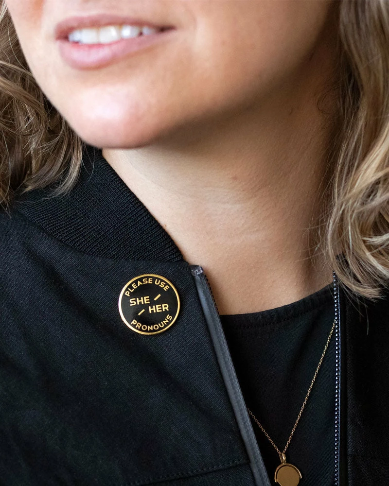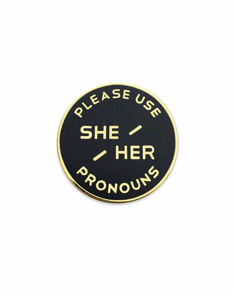 Easy-to-read She / Her identifier pin that can be worn on your lapel, or any other noticeable area. Let people know how you prefer to be addressed, taking some of the awkwardness and pressure off yourself while also making a small statement.