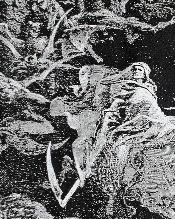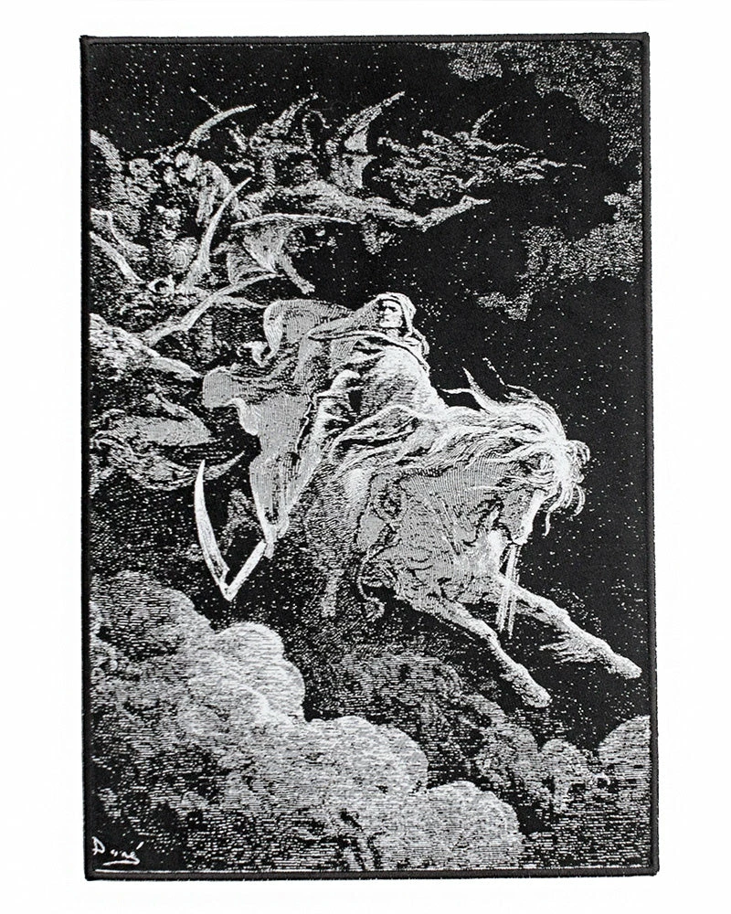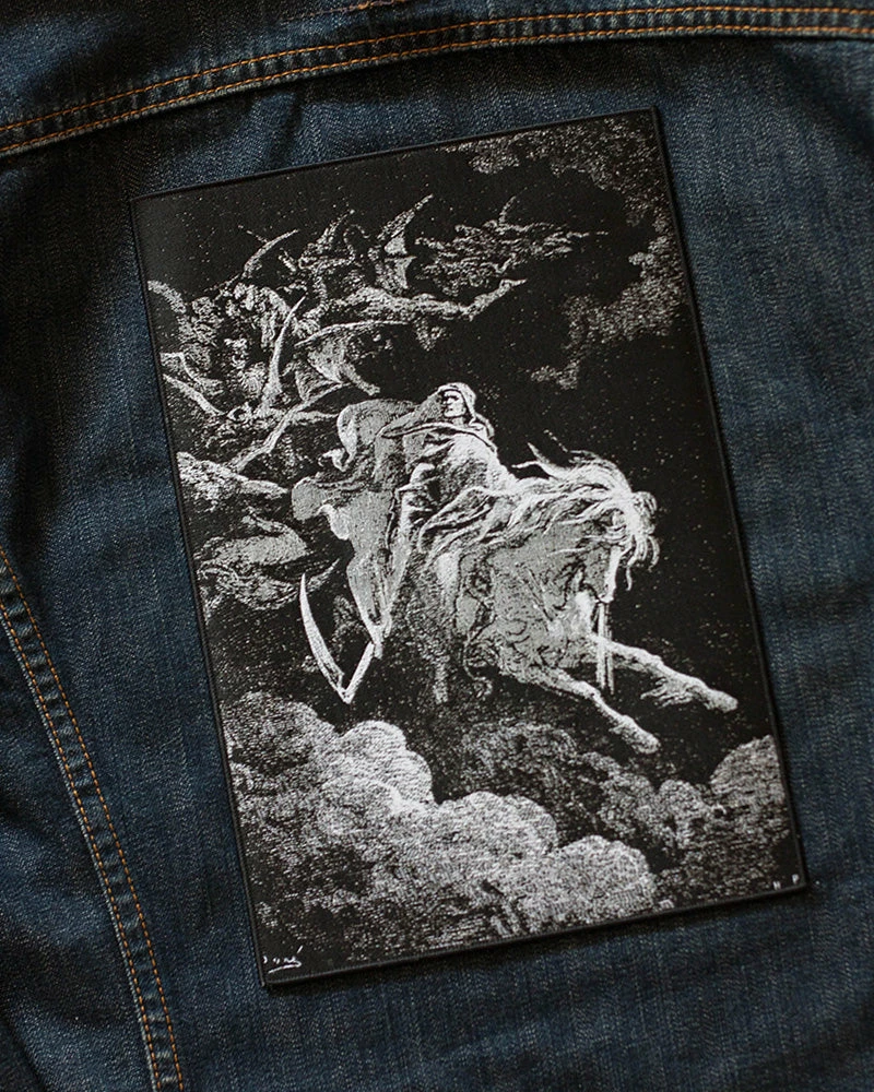 A pale horse with a rider named Death, one of the Four Horsemen come to lay claim of the Earth during the Apocalypse. A classic Gustave Dore art history painting turned into a modern fashion statement patch.