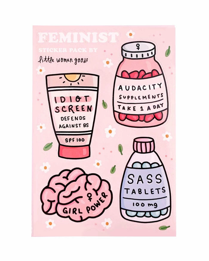 Pack of designs relating to Girl Power: Audacity Supplements, Sass Tablets, Idiot Screen.