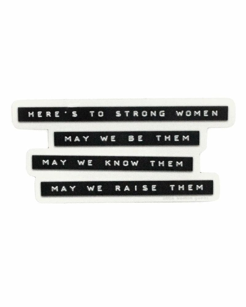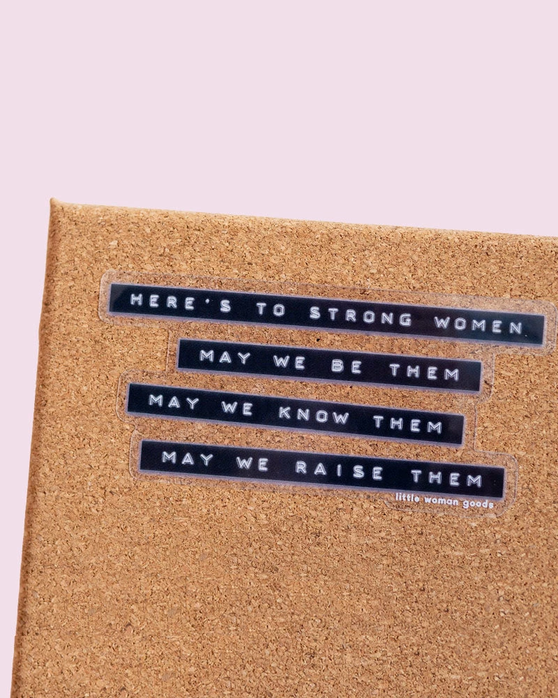 Here’s to strong women. May we be them, may we know them, may we raise them. Text design in a faux, retro label maker motif.