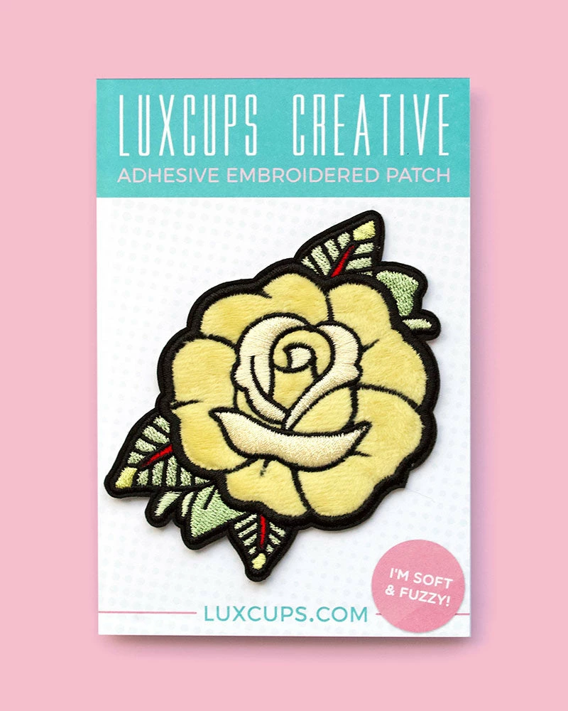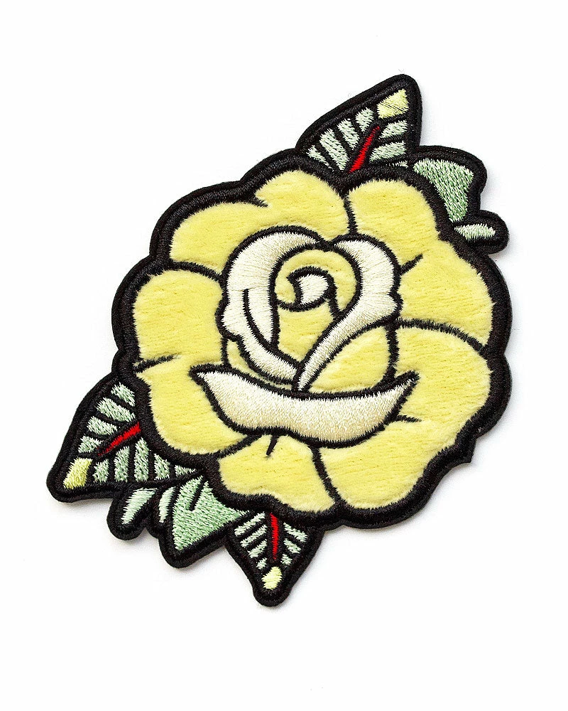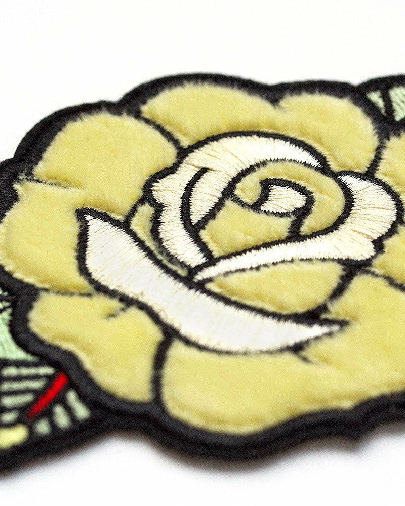 This classic jacket patch is also reminiscent of traditional tattoo styling. A yellow rose is more unique than a red one, plus this one is fuzzy! A great touch for any feminine, yet tough, person.