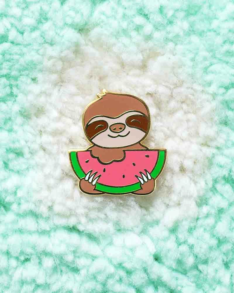 Be as content as this sloth slowly enjoying a juicy snack. Wear this lapel pin for some calming vibes.