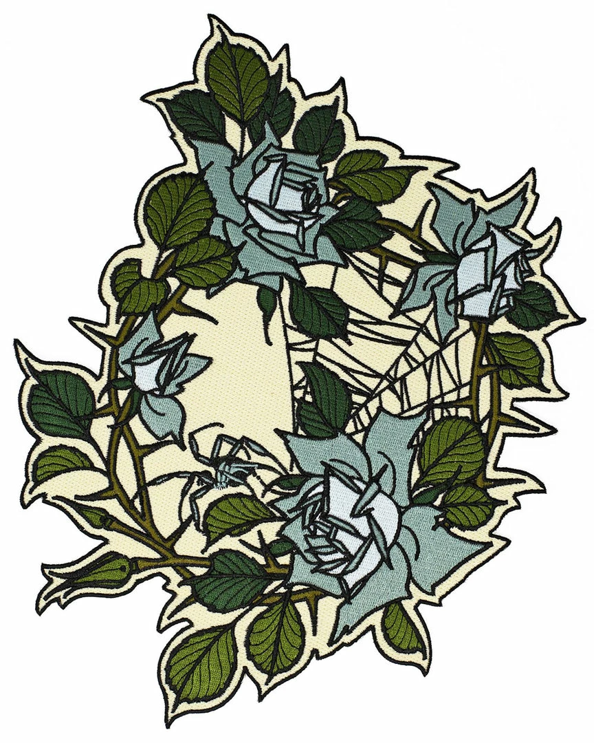 A spider makes a web in a ring of roses. The subdued hues of the embroidery invoke a melancholy feel with the imagery.