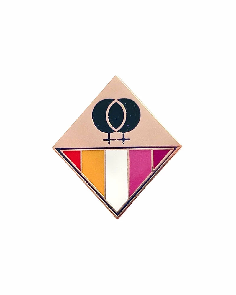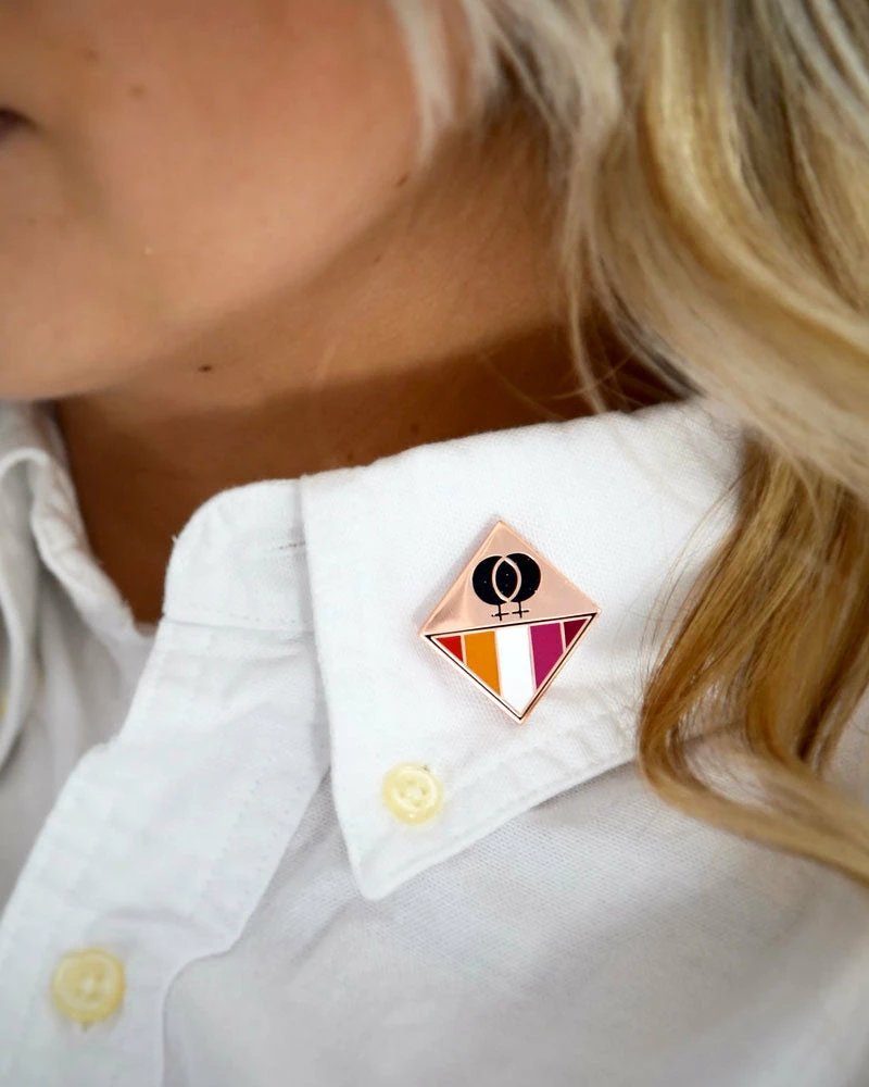 Lesbian and proud of it? Hell yeah! This modern classic design can be added to a hat, backpack, or lapel to signify your love for women as a woman.