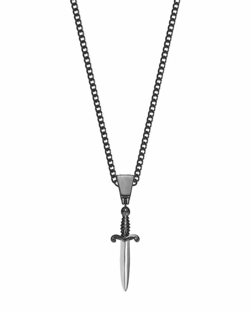 Sophisticated and savage, this 2 tone dagger design is has a black handle leaving the steel blade untouched. Protect ya neck, heart, and throat!