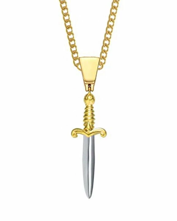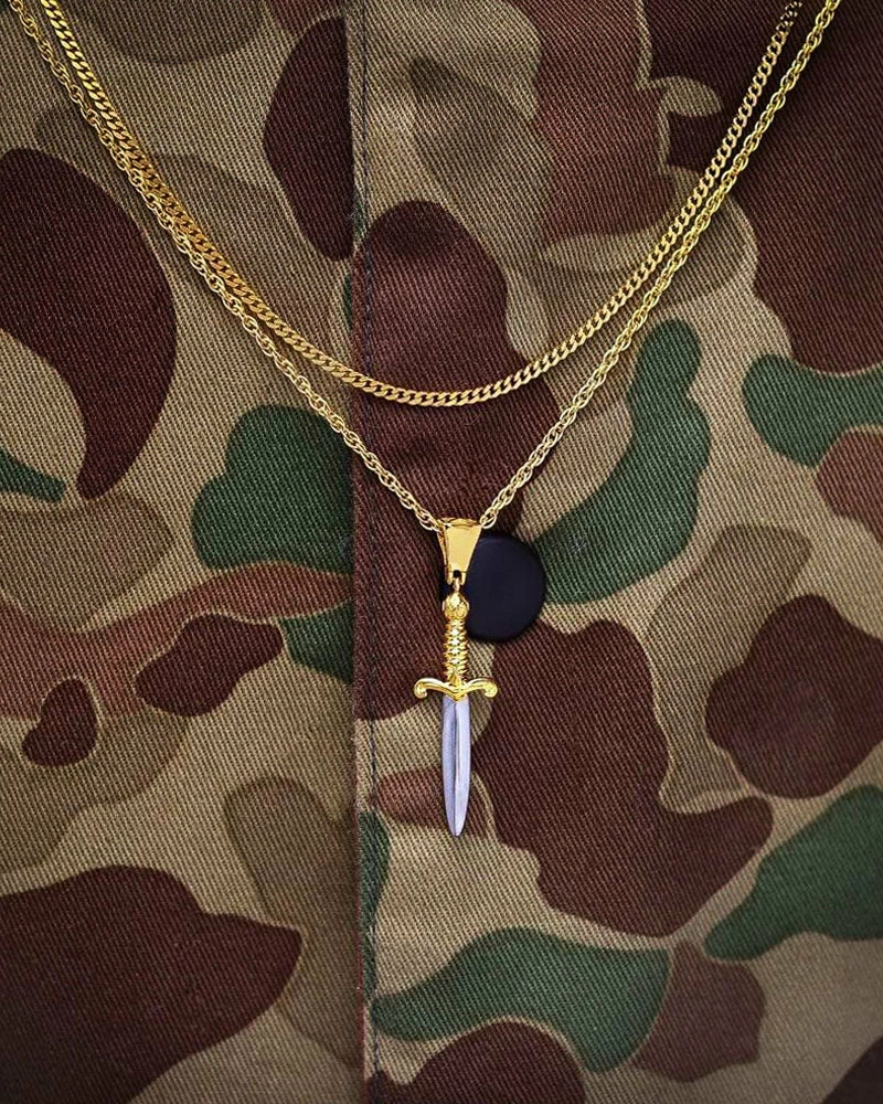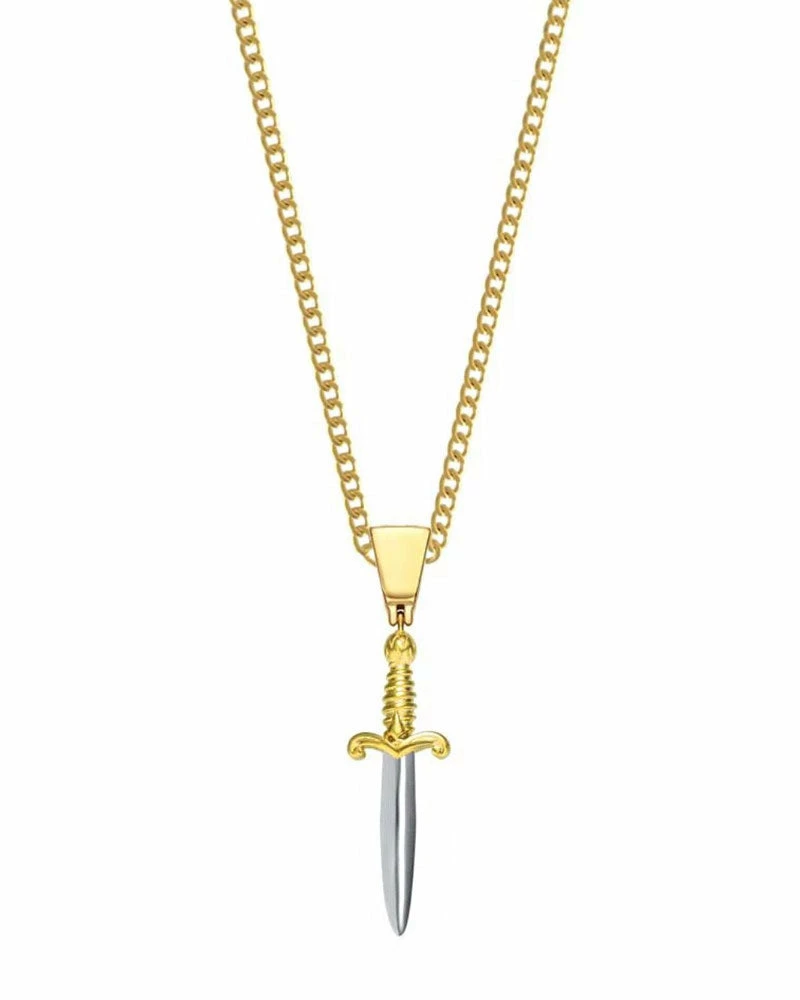 Sophisticated and savage, this 2 tone dagger design is dipped in gold leaving the steel blade untouched. Protect ya neck, heart, and throat!
