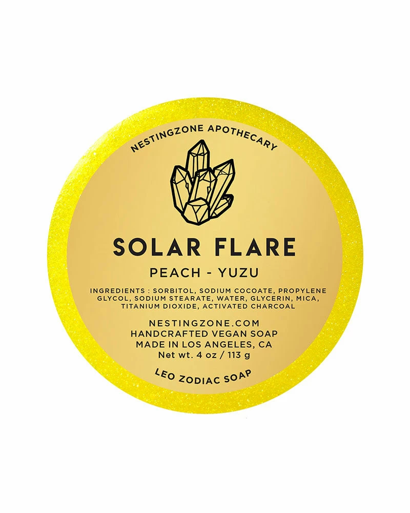 The circular shape in this zodiac-inspired soap bar is meant to help complete you, and bring you full circle. It’s a perfect birthday gift, but also a great soap for any who is drawn to it. This Solar Flare scent is a zesty and fruity blend of Yuzu and Peach crafted with the intention to reignite your passions.