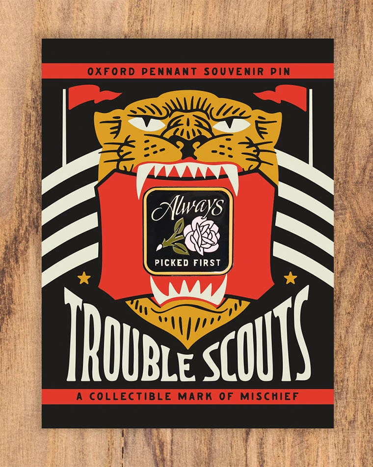Collaboration between Oxford Pennant and Keith Buckley of the band Every Time I Die as part of their “Trouble Scouts” collection, collectible souvenir pins fit for mischievous folks and troublemakers.