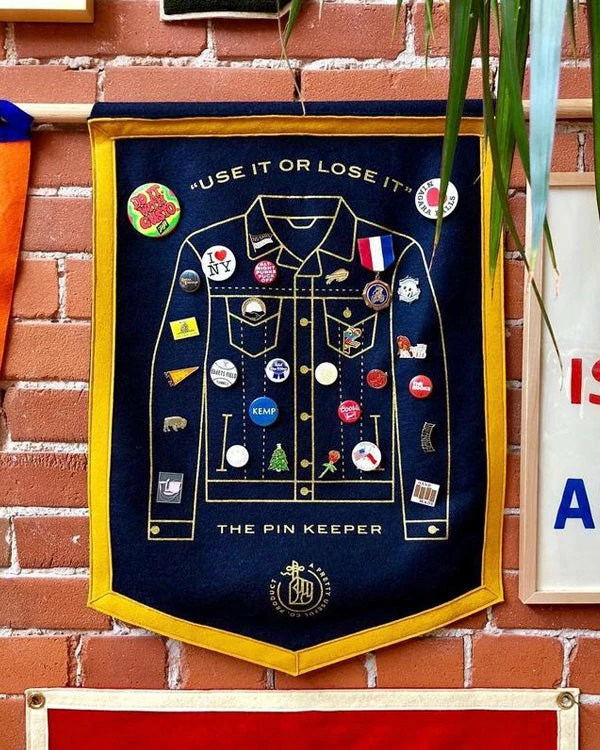Do you collect enamel pins? Do they not all fit onto your jacket anymore? This hangable banner features jean jacket lineart where you can place pins to view them until you’re ready to use them! The soft, felt material allows you to pin through to attach the pinback, and look at them like the little pieces of art that they are.