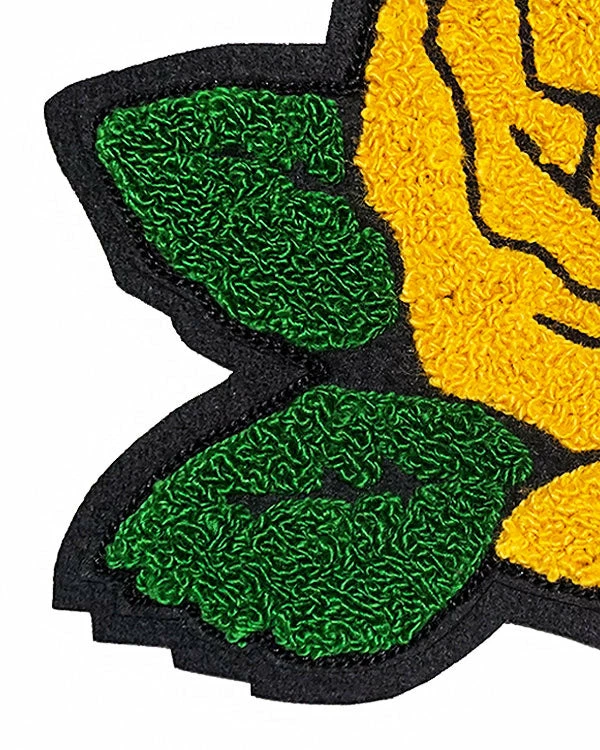 A classic yellow rose design with attention to detail, that would serve as the perfect centerpiece to a denim or leather jacket.