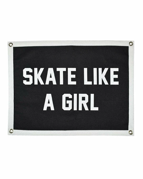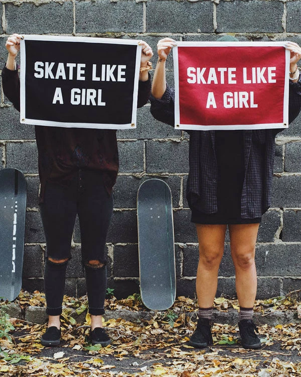 Creating an inclusive community by promoting confidence, leadership, and social justice through skateboarding this banner is a collaboration between Oxford Pennant and Skate Like A Girl.