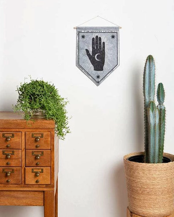 A moon in the palm stands for being strong-minded and self-assertive. Bring some otherworldly confidence into your home with this unique and detailed wall hanging.