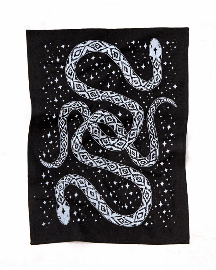 Intertwining snakes on a starry background make for a dark and mysterious setting.