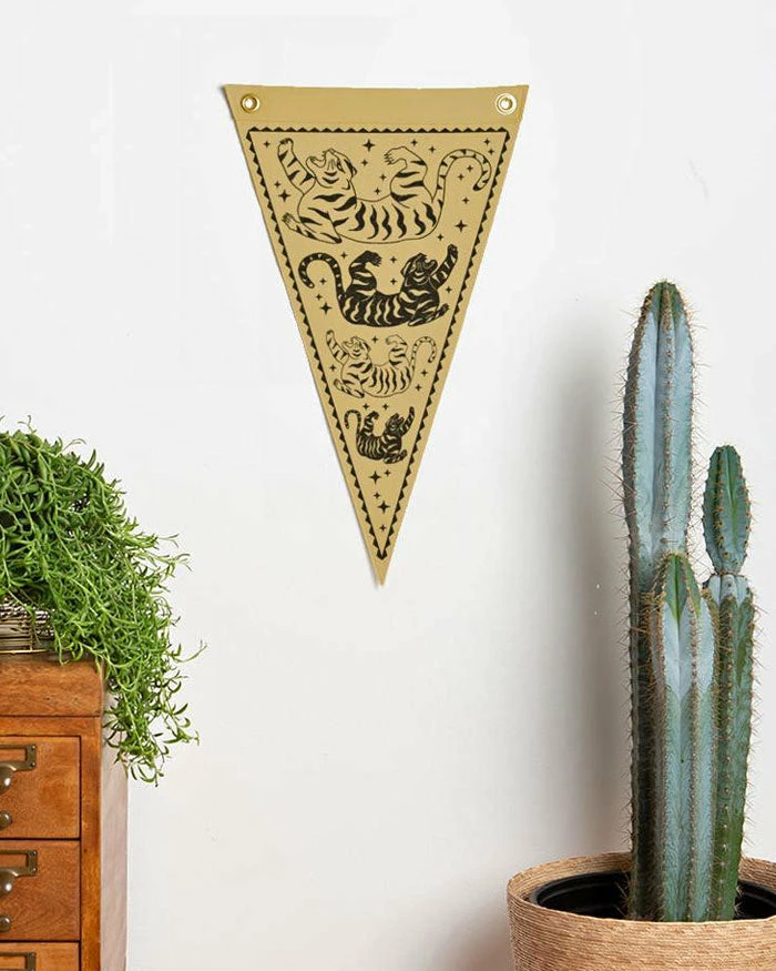 Playful yet powerful tigers lounge about in the starlight. This unique oversized pennant is made by hand, and adds a simple yet captivating detail to any room. (We suggest a bedroom! Claim your cozy territory.)