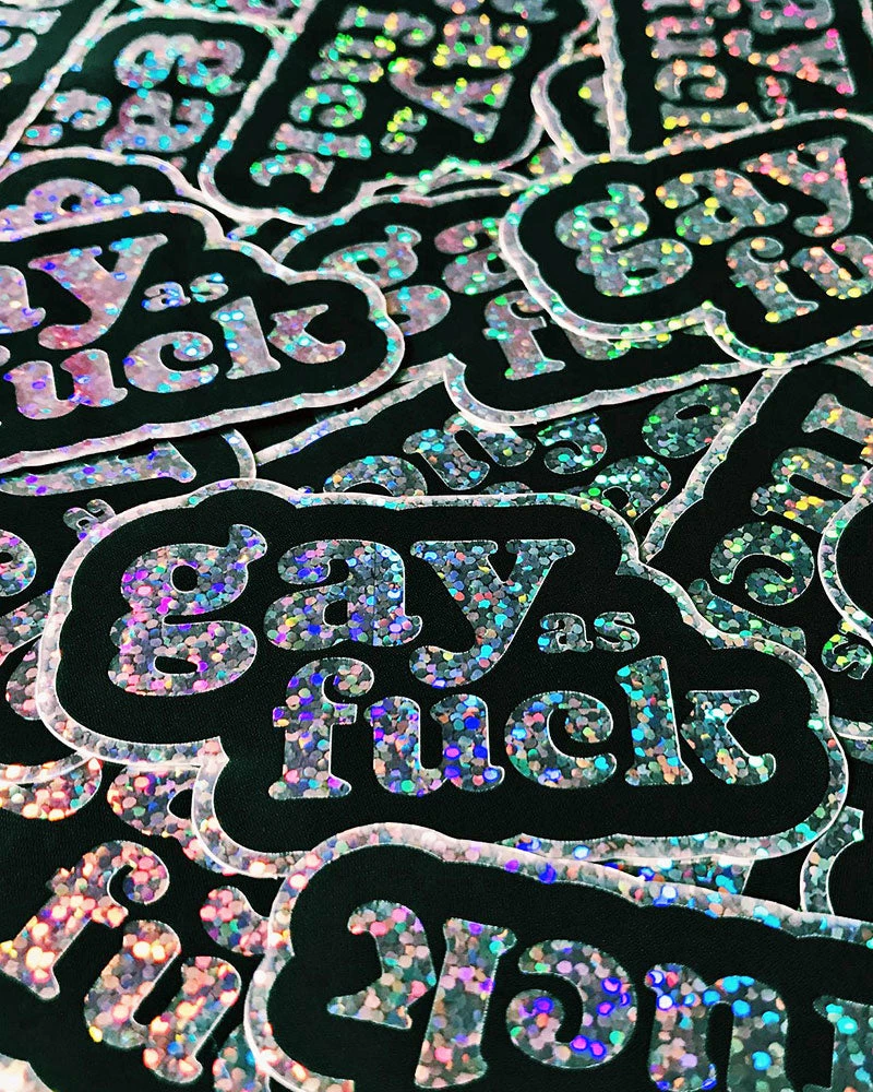 Sparkly rainbow confetti background make this design super gay, fuck yeah!
