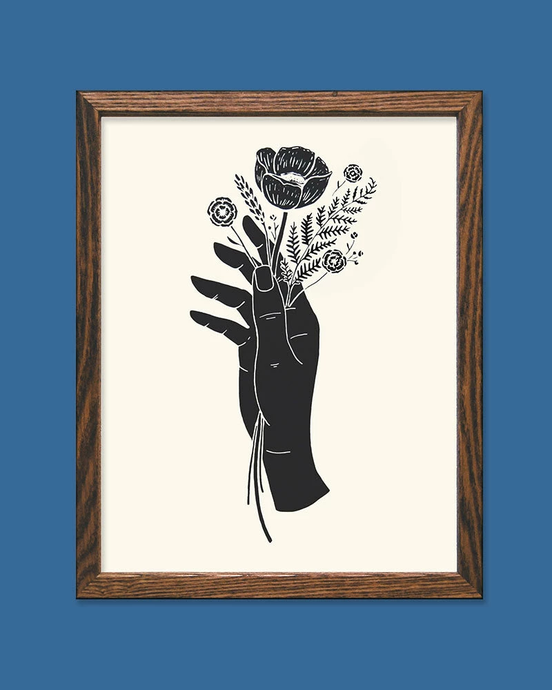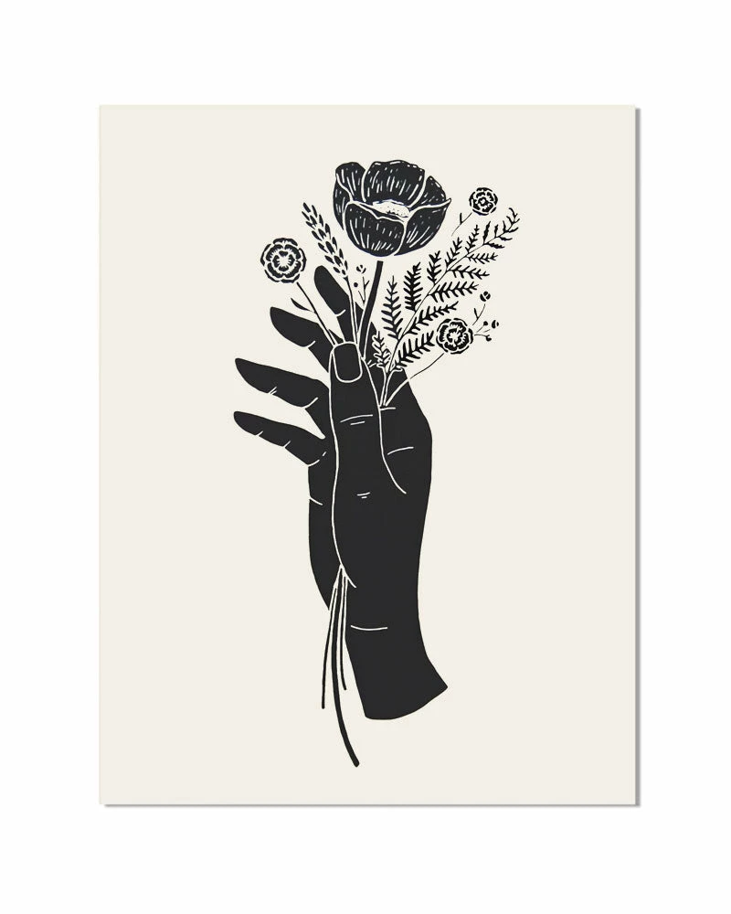 Original artwork of a hand holding a delicate bouquet of wildflowers. This botanically-inspired print makes a modern and elegant addition to kitchens and nurseries, and is the perfect gift for plant and garden enthusiasts.