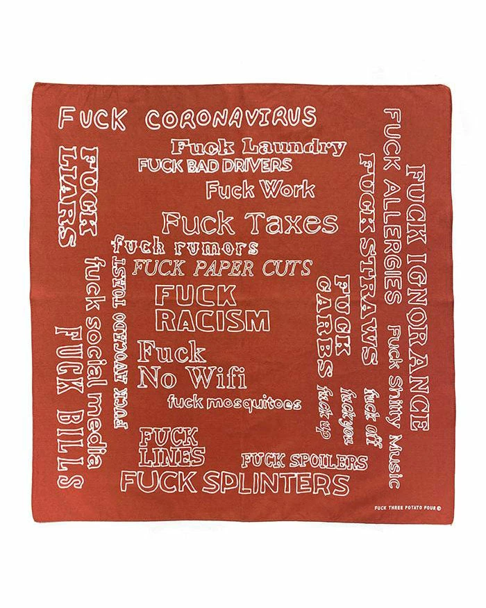 Inspired by vintage 1970’s handmade bandanas found at motorcycle swap meets and vintage markets. This FUCK bandana covers off on all of our current gripes and grievances.