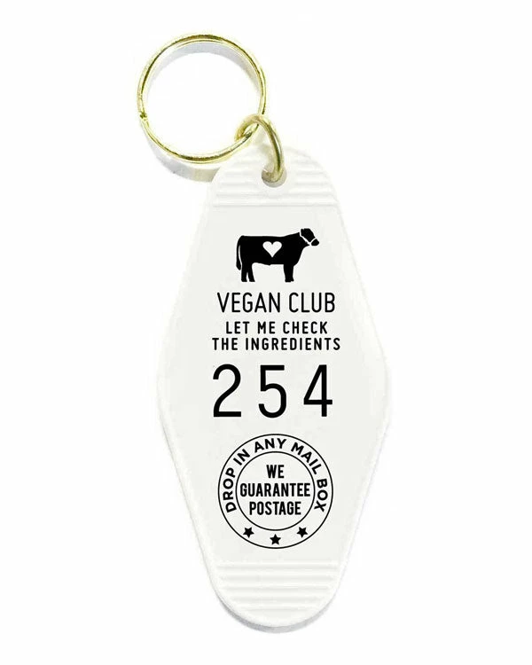 An adaptation of a classic vintage hotel / motel key tag, these designs have a nostalgic club feel. This one is for animal lovers, vegetarians, and more specifically the most hardcore animal fans—vegans!Â