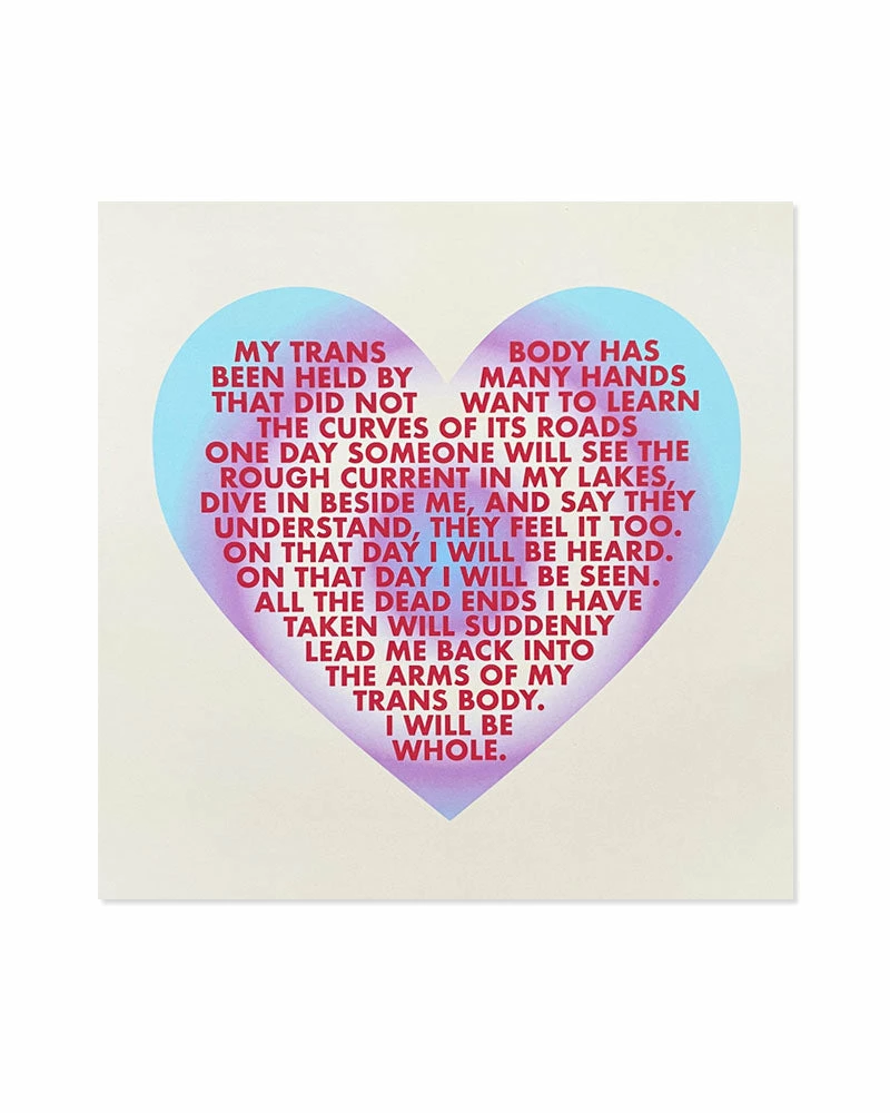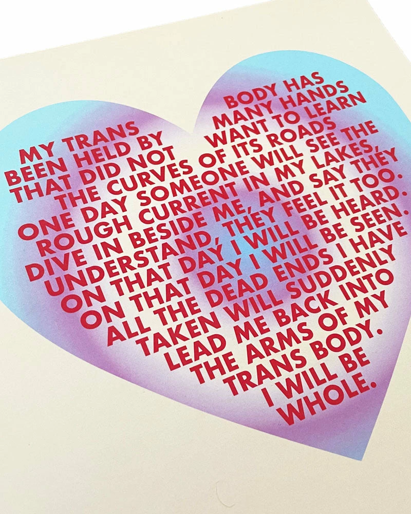 My trans body has been held by many hands that did not want to learn the curves of its roads. One day someone will see the rough current in my lakes, dive in beside me, and say they understand, they feel it too. On that day I will be heard. One that I will be seen. All the dead ends I have taken will suddenly lead my back into the arms of my trans body. I will be whole.