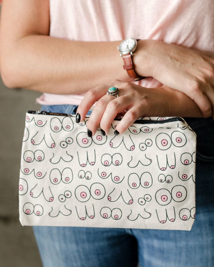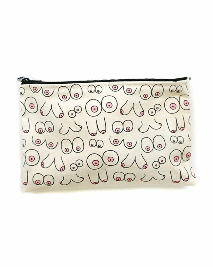 Boobs of all different shapes and sizes adorn this playful bag fit for personal hygiene products, makeup, knives, cookies, hand lotion, and anything you please.