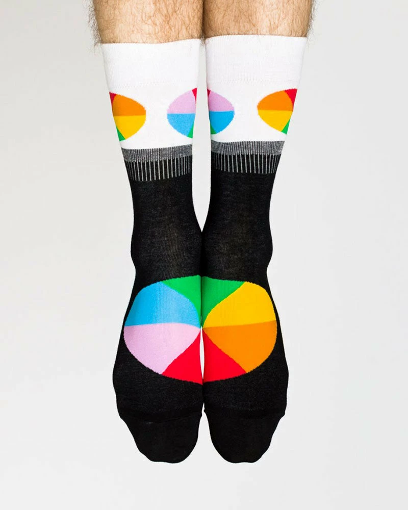 These funky and unique socks are perfect for anyone into art, design, or works on the computer. The color wheel comes together when you put your feet together! Also features a distinct statement black/white color split above the ankle.