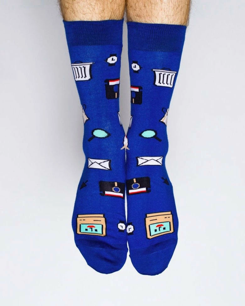 Retro computer graphics adorn these hip, yet geeky socks. Icons for a floppy disk, paint palette, trash can, and email envelope will be appreciated by early computer graphic designs. Great work socks for those that sit at a computer at the office!