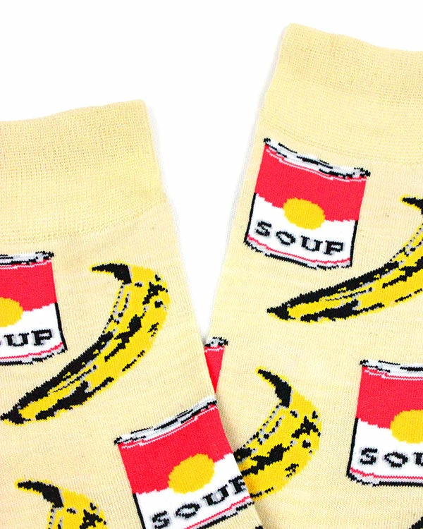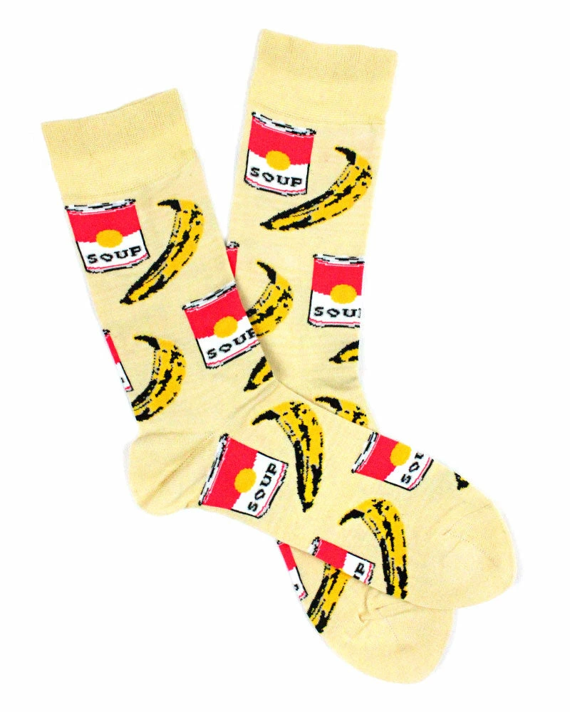 Socks with sophisticated taste. Classic soup can and banana screenprint look from the Warhol-like Pop Art movement.