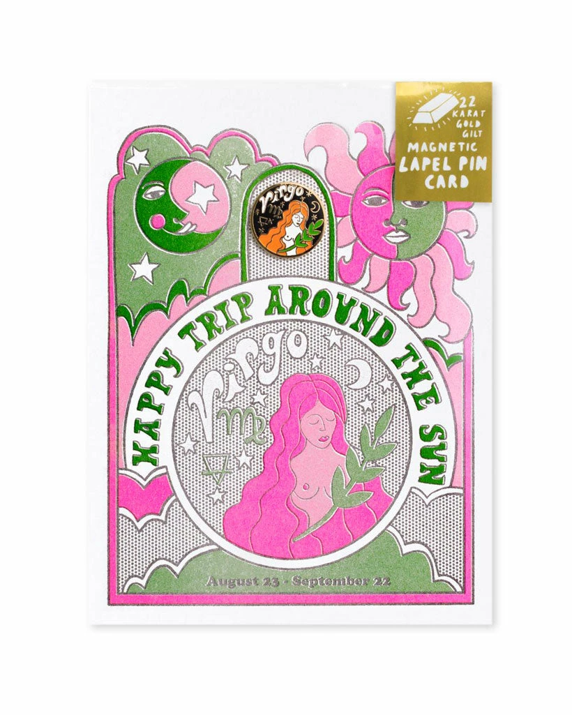 Give the gift of celebrating another happy year around the sun! For the astrology-inclined friend, this birthday card combo gift is perfect. After receiving their card, the attached enamel lapel pin can be worn to show off their birthday year and zodiac sign with pride.